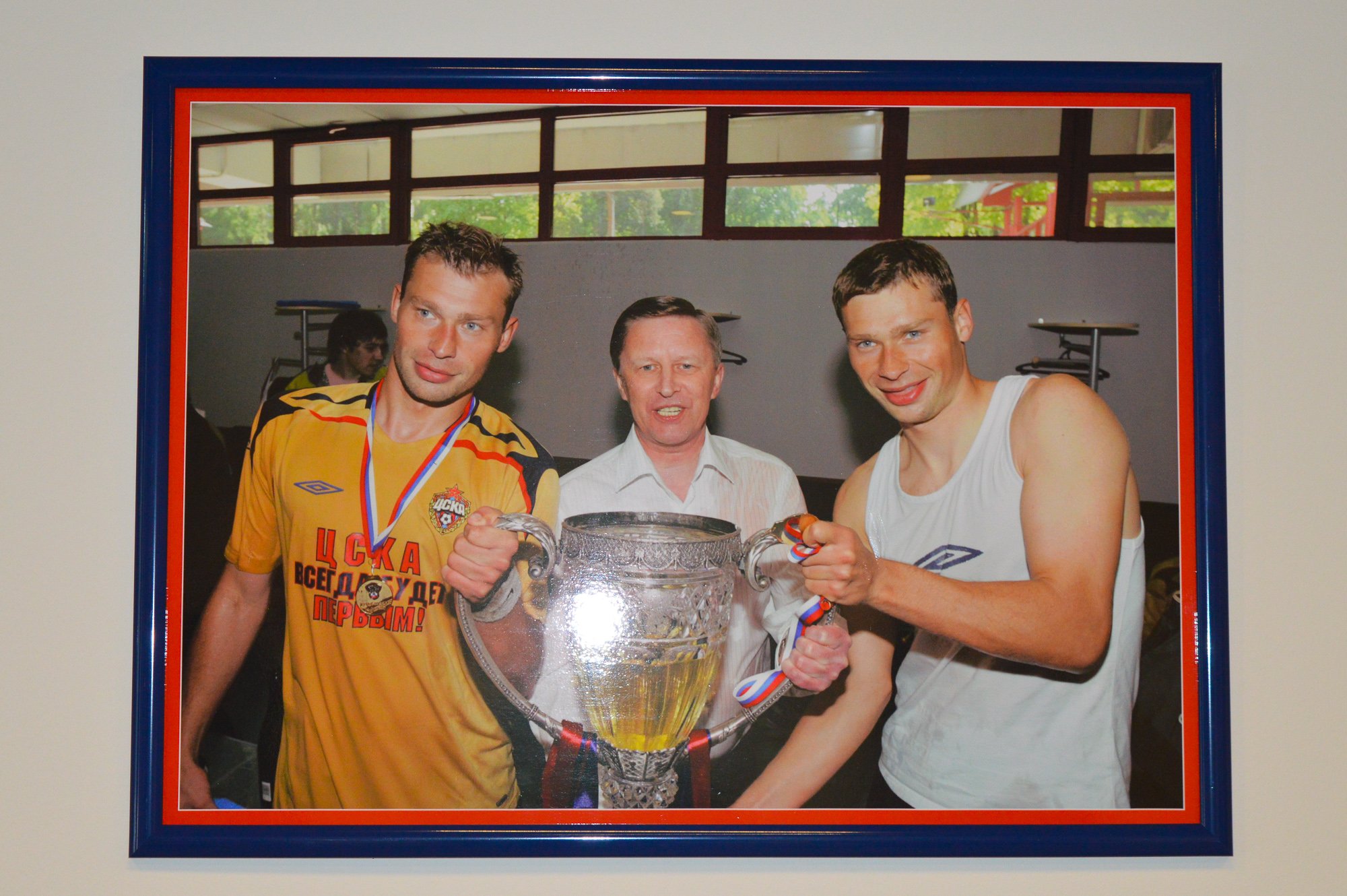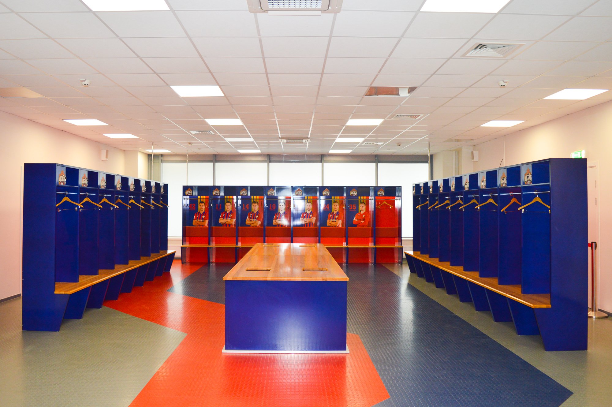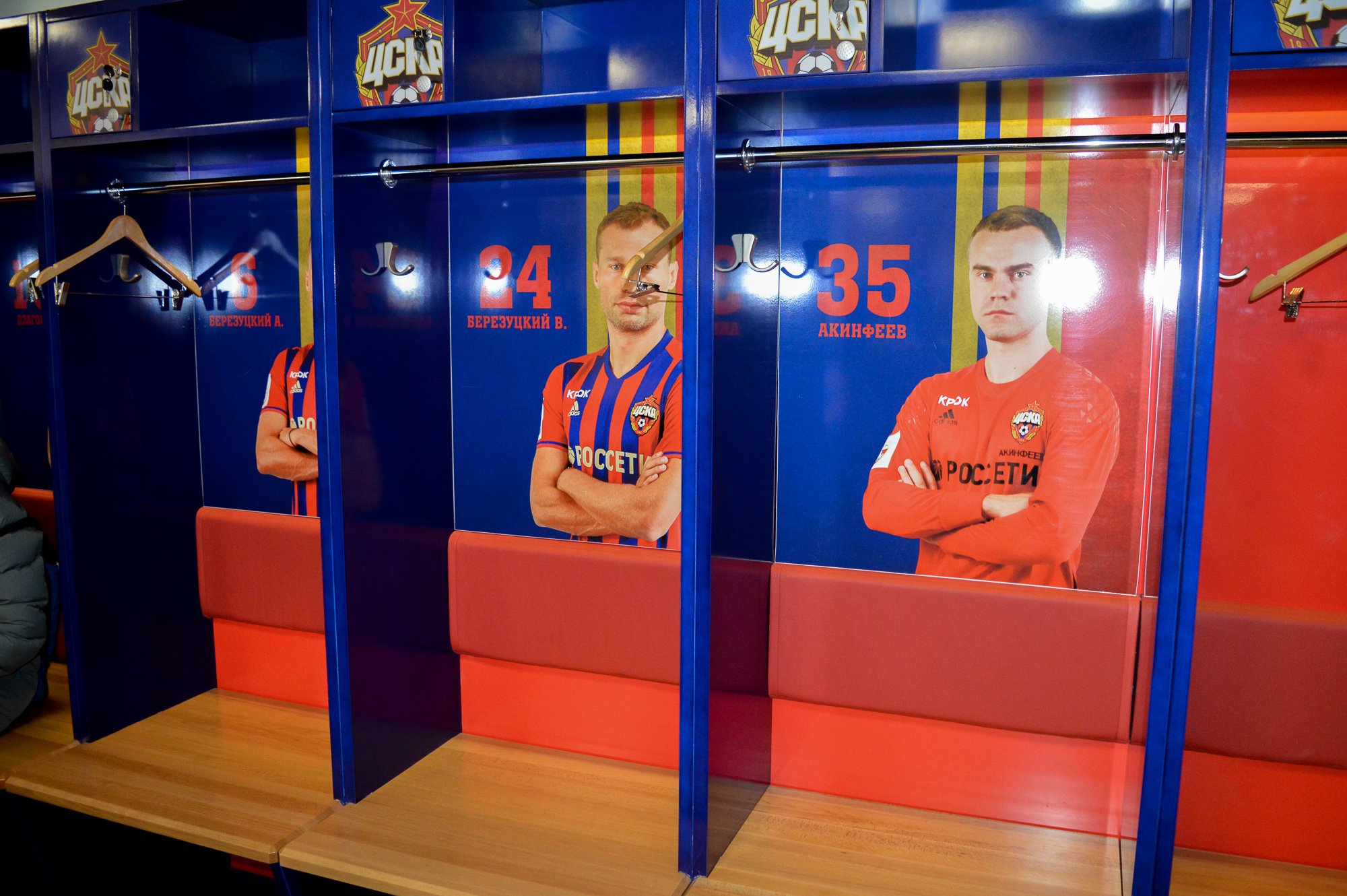 Раздевалка ЦСКА просторная и немного аскетичная. Место каждого футболиста обозначено фотографией и номером. Есть и пустые «ячейки» игроков, которые уже не играют в клубе.