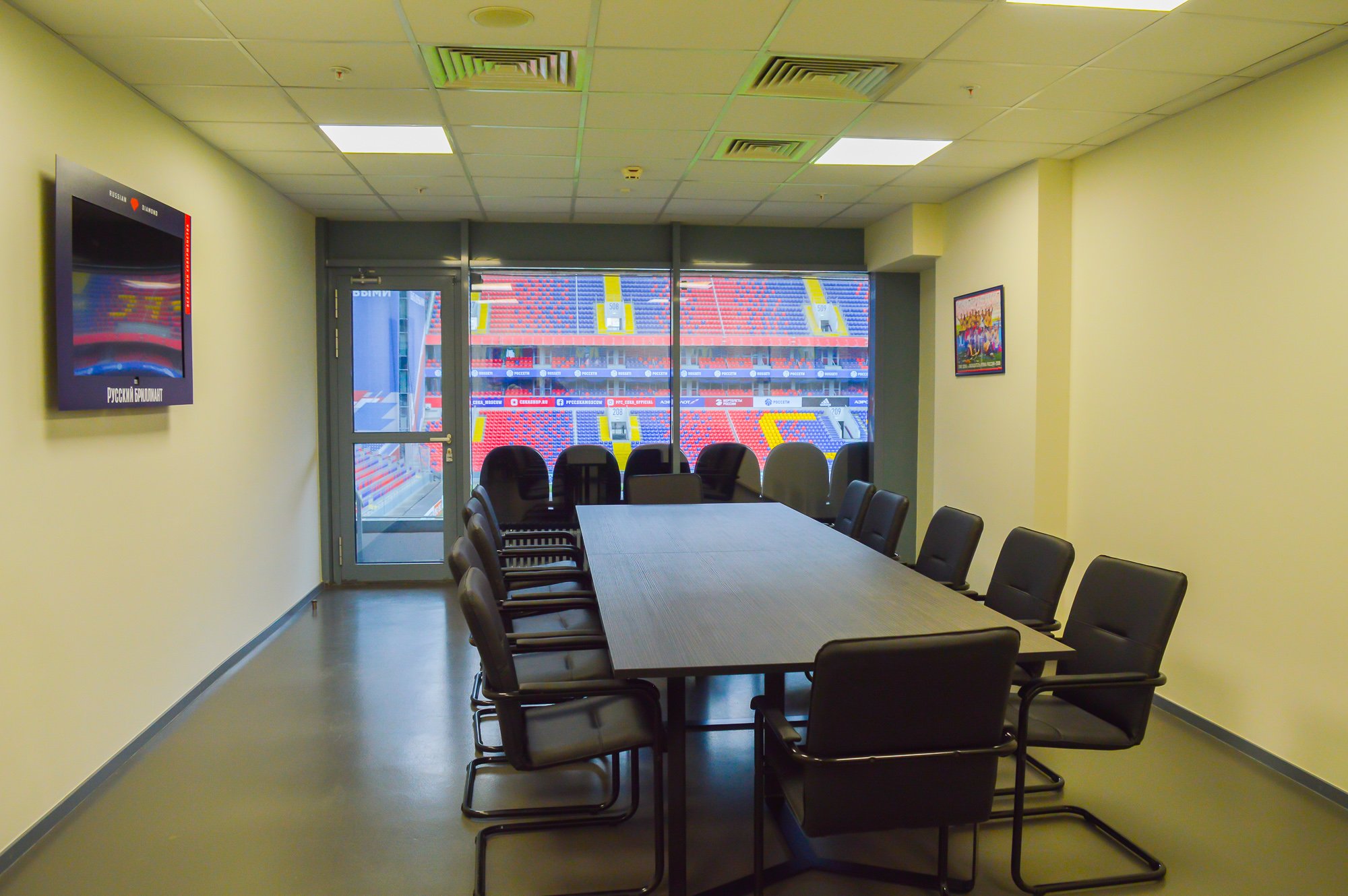Возвращаемся внутрь стадиона. Заглядываем в комнату для работы журналистов и зал пресс-конференций.