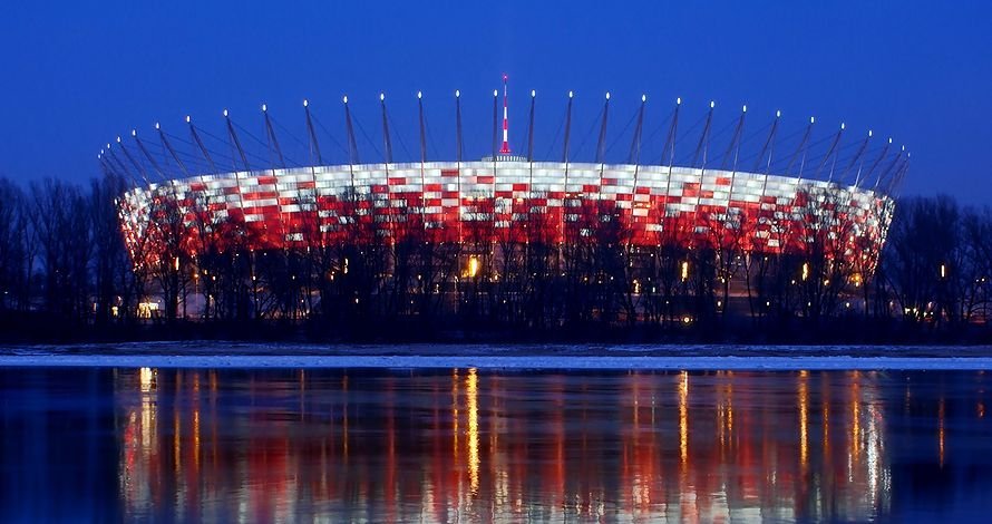 «Национальный стадион» появился на берегу реки Висла к ЧЕ-2012 по футболу. Его фасад и трибуны красно-белые, как цвета национального флага.