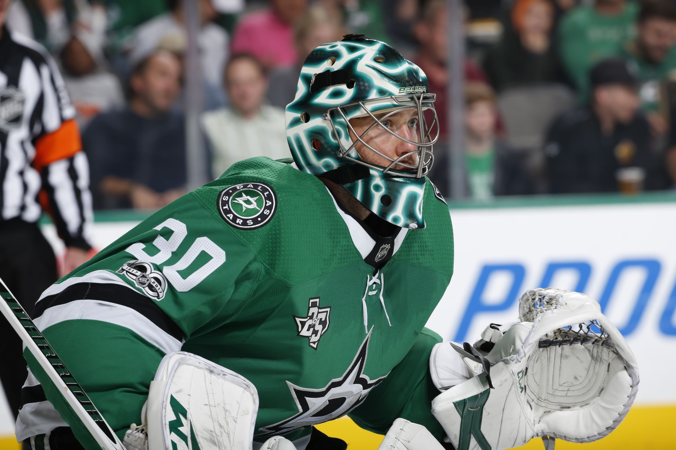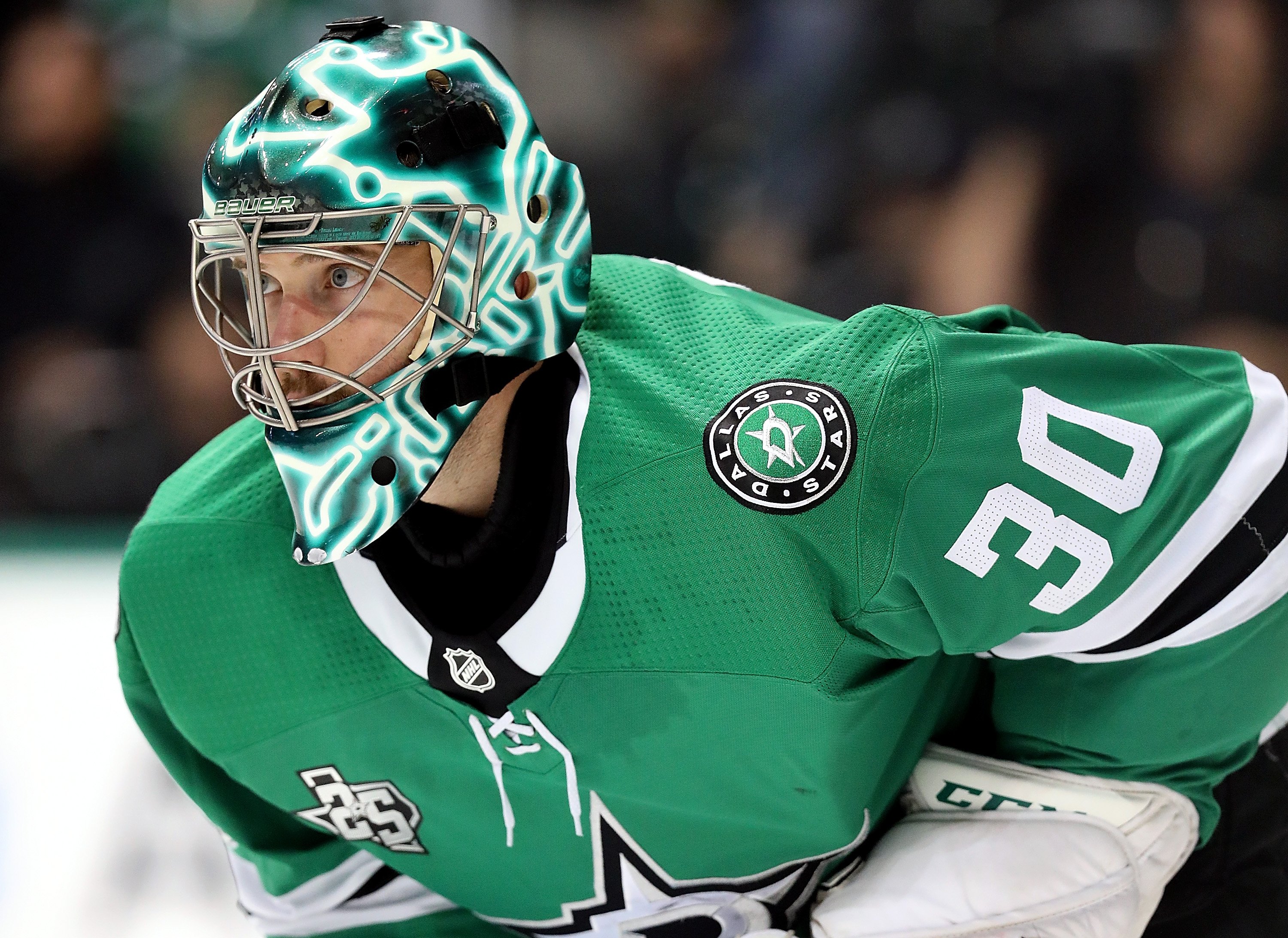 Ну очень крутой шлем в этом сезоне у Бена Бишопа. Элемент экипировки голкипера насыщенного зеленого цвета украшен контурами штата Техас с одной стороны и логотипом клуба с другой. Если внимательно присмотреться, то на черном фоне можно разглядеть крошечные голографические силуэты Техаса. И самое главное — шлем светится в темноте.